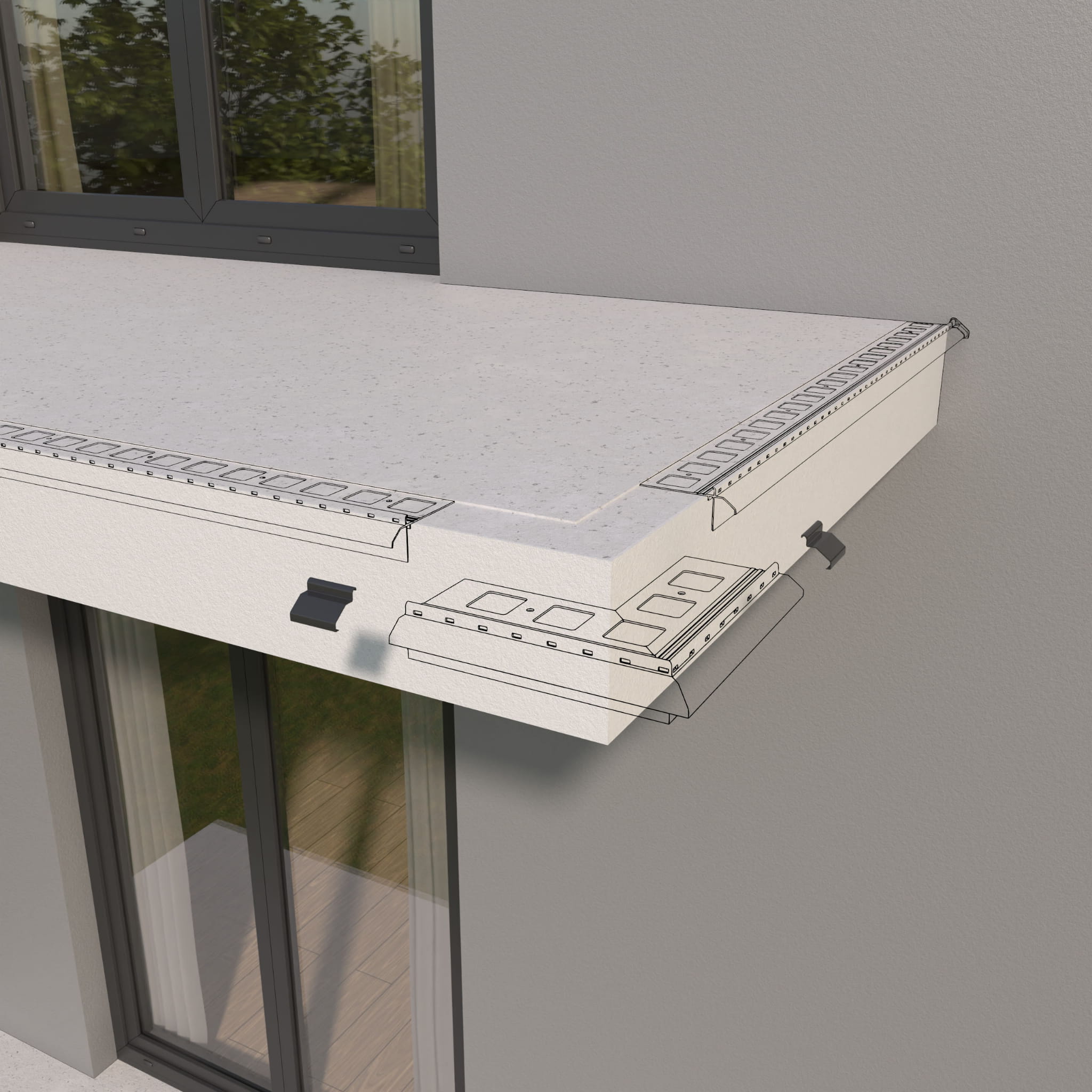 Łączniki używamy do zabezpieczenia, oraz estetycznego zamaskowania przerw dylatacyjnych, które stosujemy przy montażu systemów okapowych. Przerwy dylatacyjne powstają przy łączeniu ze sobą narożników z profilami, oraz profili z profilami.