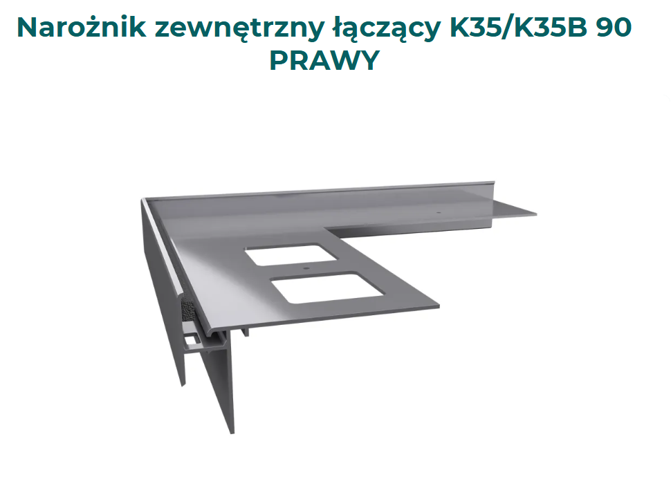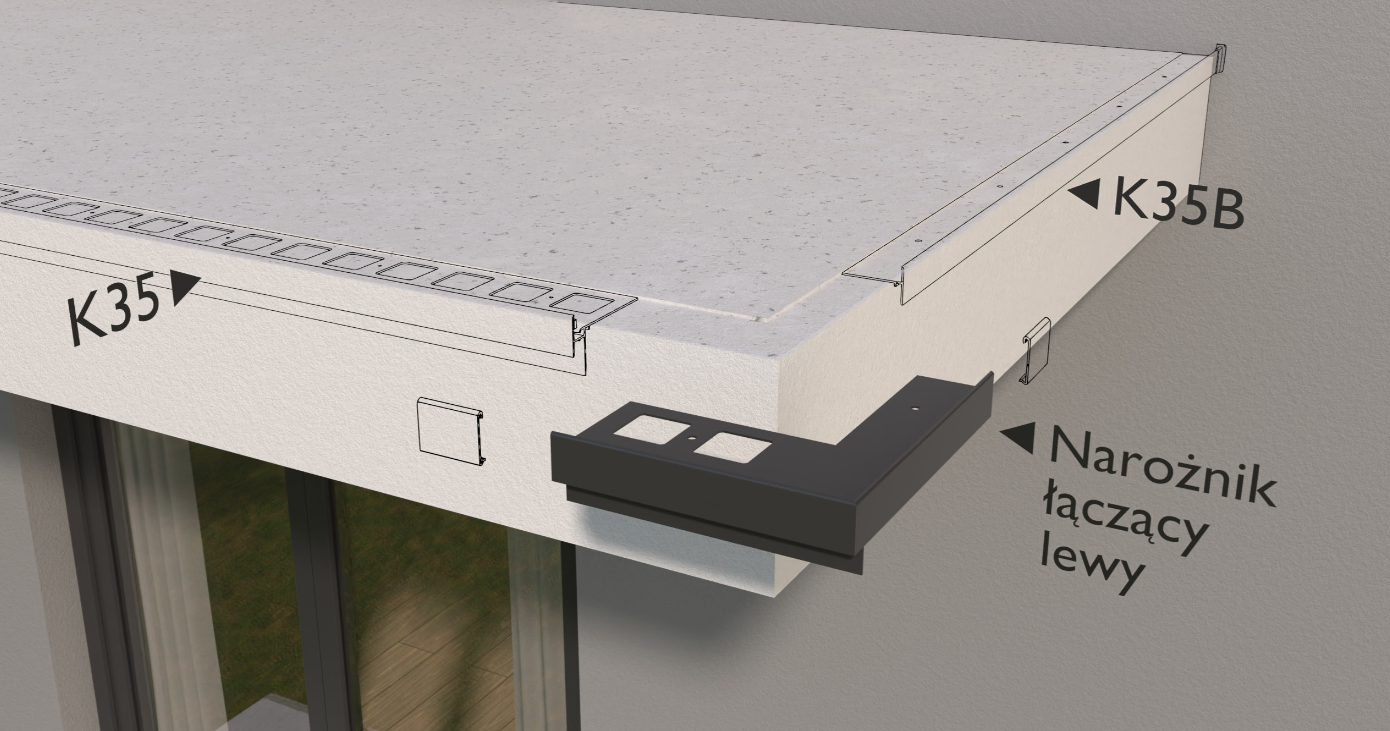 Narożnik zewnętrzny i wewnętrzny do łączenia profili okapowych głównych K35 Renoplast i bocznych K35B Renoplast. Narożnik pozwalający połączyć profil główny K35 z profilem bocznym K35B.