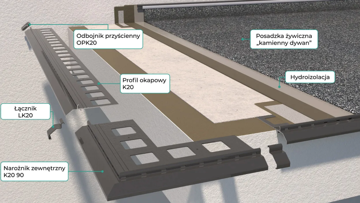 Narożnik do profilu okapowego Renoplast K20 (posadzka z żywicy typu "kamienny dywan")