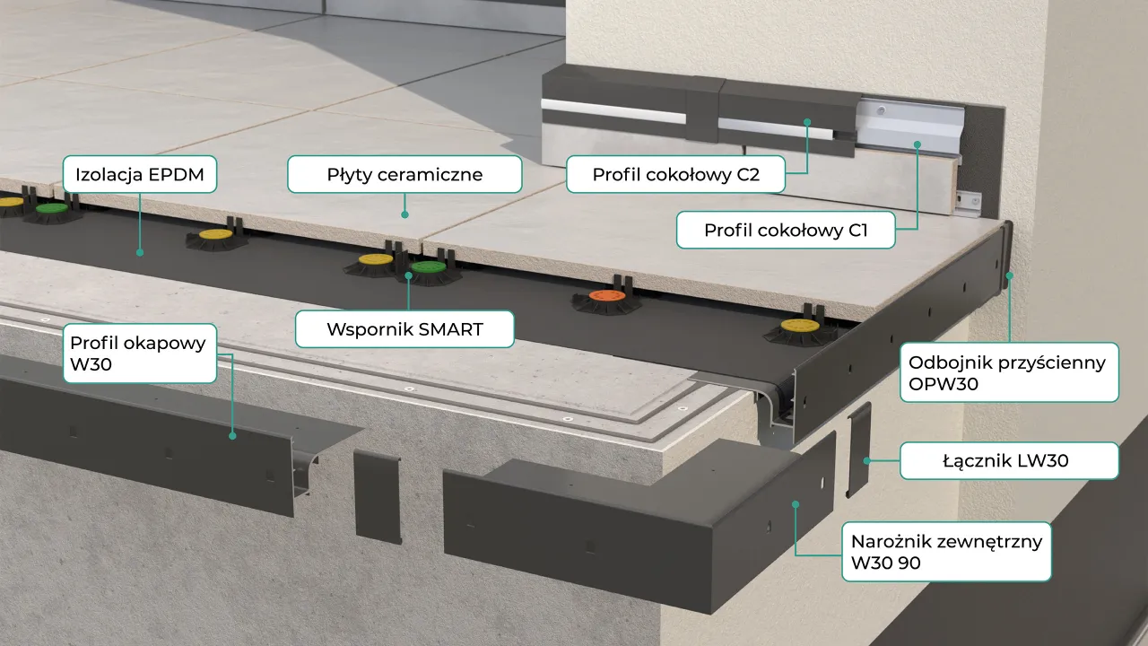 Odbojnik przyścienny z tworzywa sztucznego do wykończenia (przy elewacji) profili okapowych Renoplast W30.