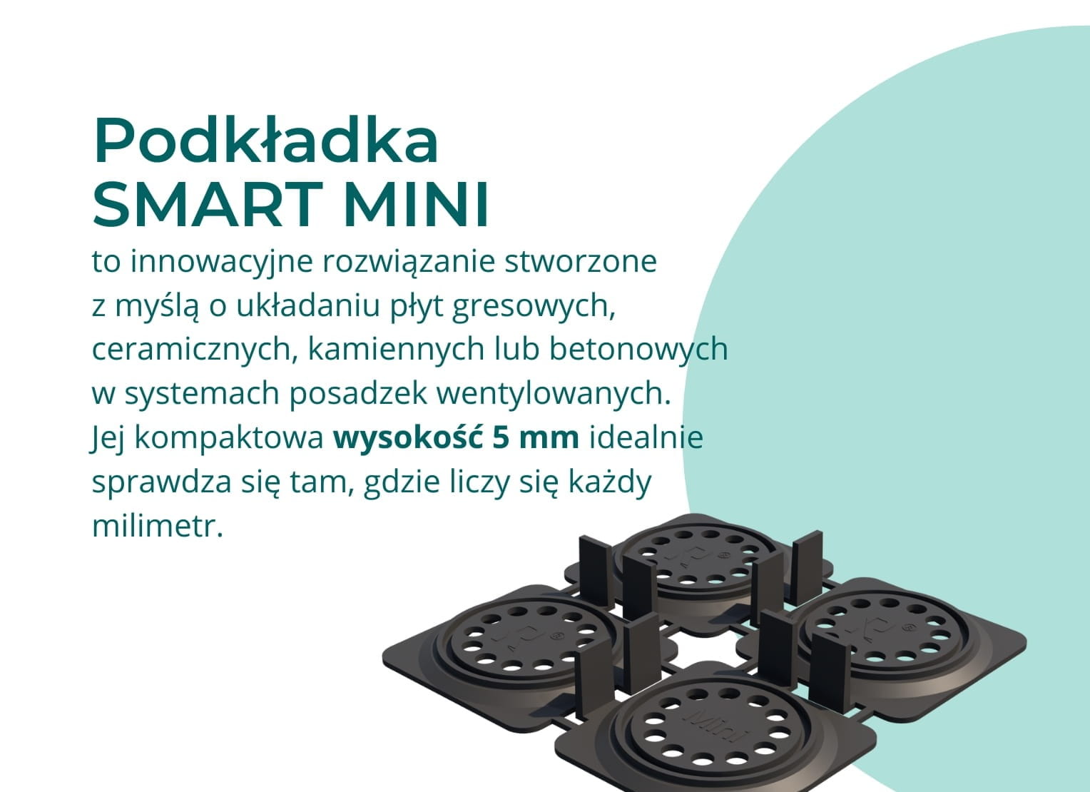 Podkładka SMART MINI to wspornik który możemy idealnie wykorzystać w miejscach gdzie kluczowa jest jak najniższa wysokość posadzki wentylowanej z płyt ceramicznych grubowarstwowych, kamiennych lub betonowych.
