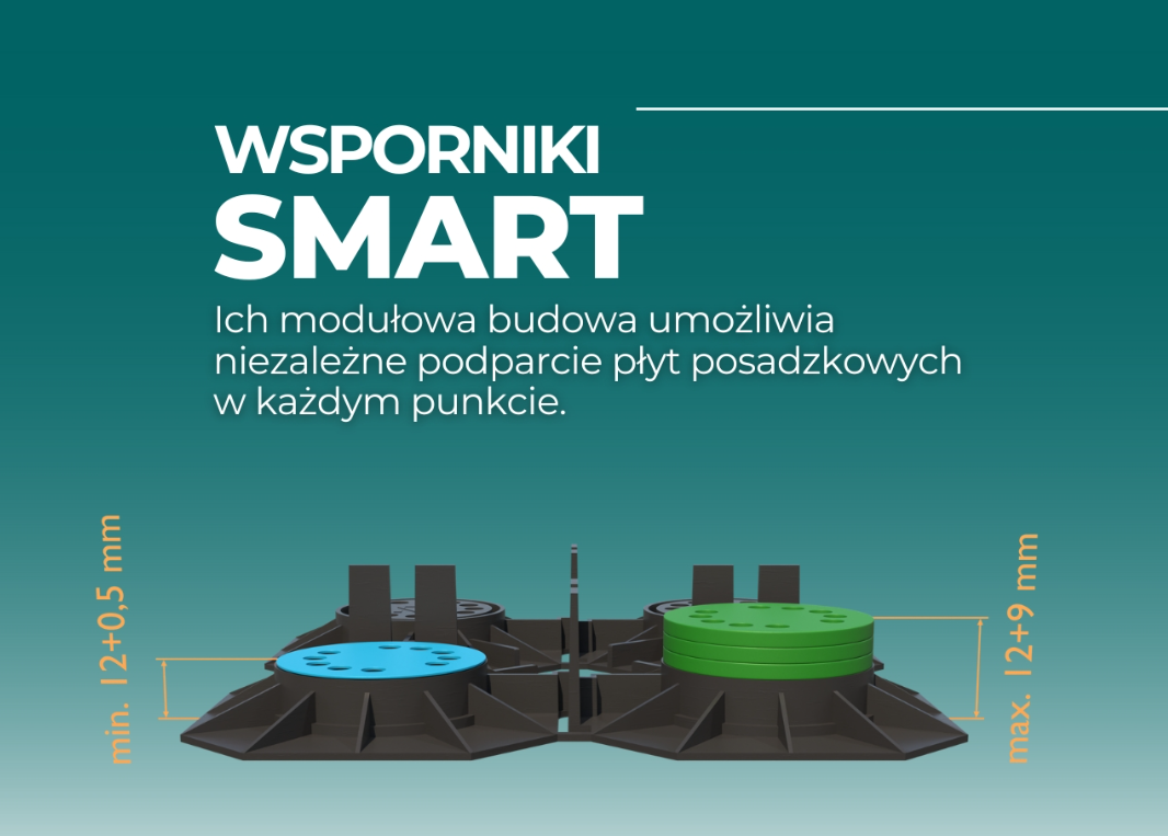 Wysokość podkładki to 12 mm. Do podkładek SMART mamy możliwość zastosować podkładki dystansowe, które pozwalają nam w łatwy sposób wypoziomować posadzkę.