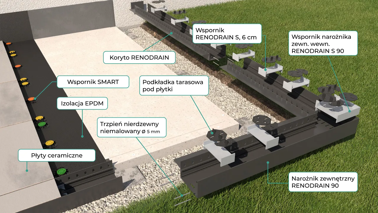 Zadaniem systemu RenoDrain Renoplast jest właściwe odprowadzenie wody opadowej poza powierzchnię tarasu wykonanego w technologii posadzki wentylowanej. Ta technologia to płyty grubości 2 cm układane na podkładkach tarasowych SMART i Renopad Pro, pod którymi znajduje się warstwa hydroizolacyjną.