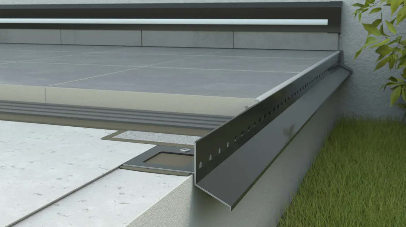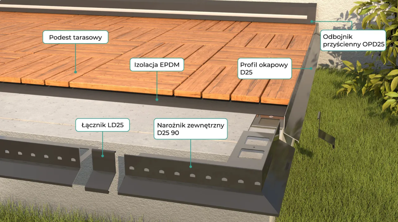Profil D25 jest uniwersalnym systemem okapowym przeznaczonym zarówno do posadzki z płytek grubowarstwowych układanych metodą tradycyjną (na zaprawie klejowej) oraz do podestów tarasowych (parkietów, desek naturalnych i kompozytowych) układanych bezpośrednio na hydroizolacji (np. membranie EPDM).