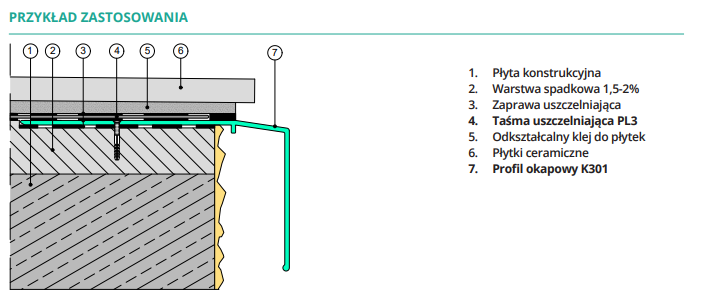 K301 jest profilem okapowym o oryginalnym kształcie co zapewnia pełne odprowadzenie wody z posadzki. Dzięki przedłużonemu kapinosowi nadaje balkonowi lub tarasowi solidny wygląd. Przeznaczony do posadzek układanych na zaprawie klejowej.
