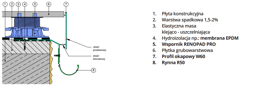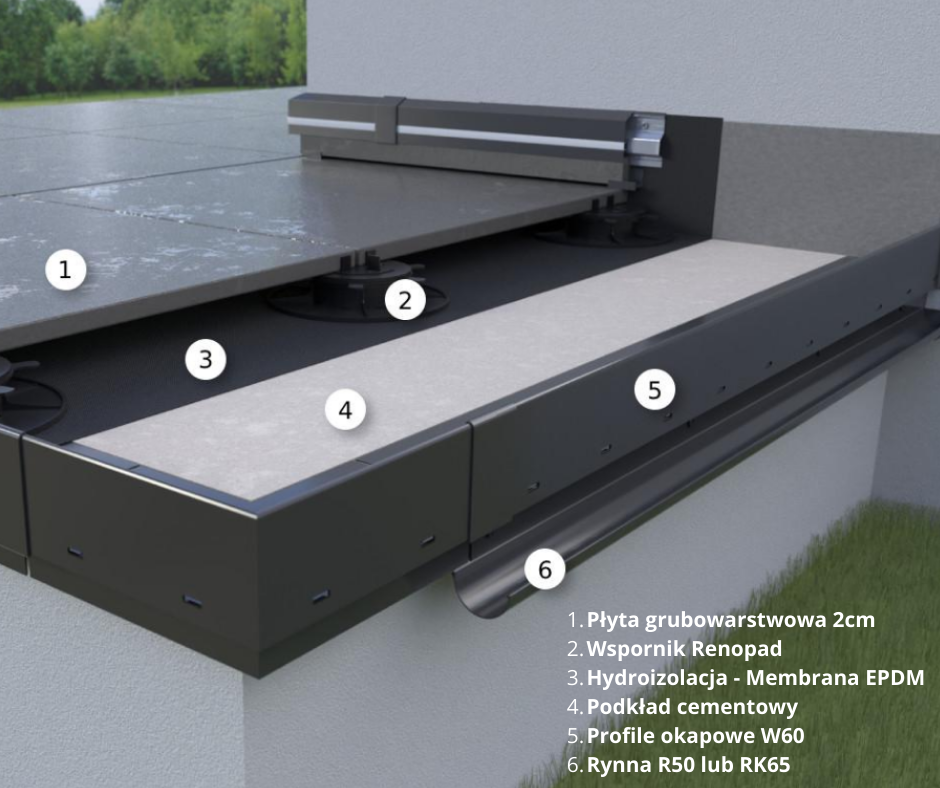 - Płyty gresowe o grubości 2 cm układane na wspornikach Renopad lub RenoPad PRO