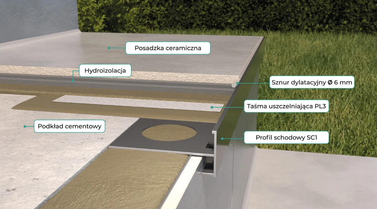 Specjalna budowa profilu SC1 pozwala na wykończenie jednym profilem zarówno stopnicę oraz podstopnicę oraz policzek schodów. Kształt profilu schodowego pozwala we właściwy sposób odprowadzić wilgoć spod okładzin schodów dzięki zastosowanym szczeliną.
