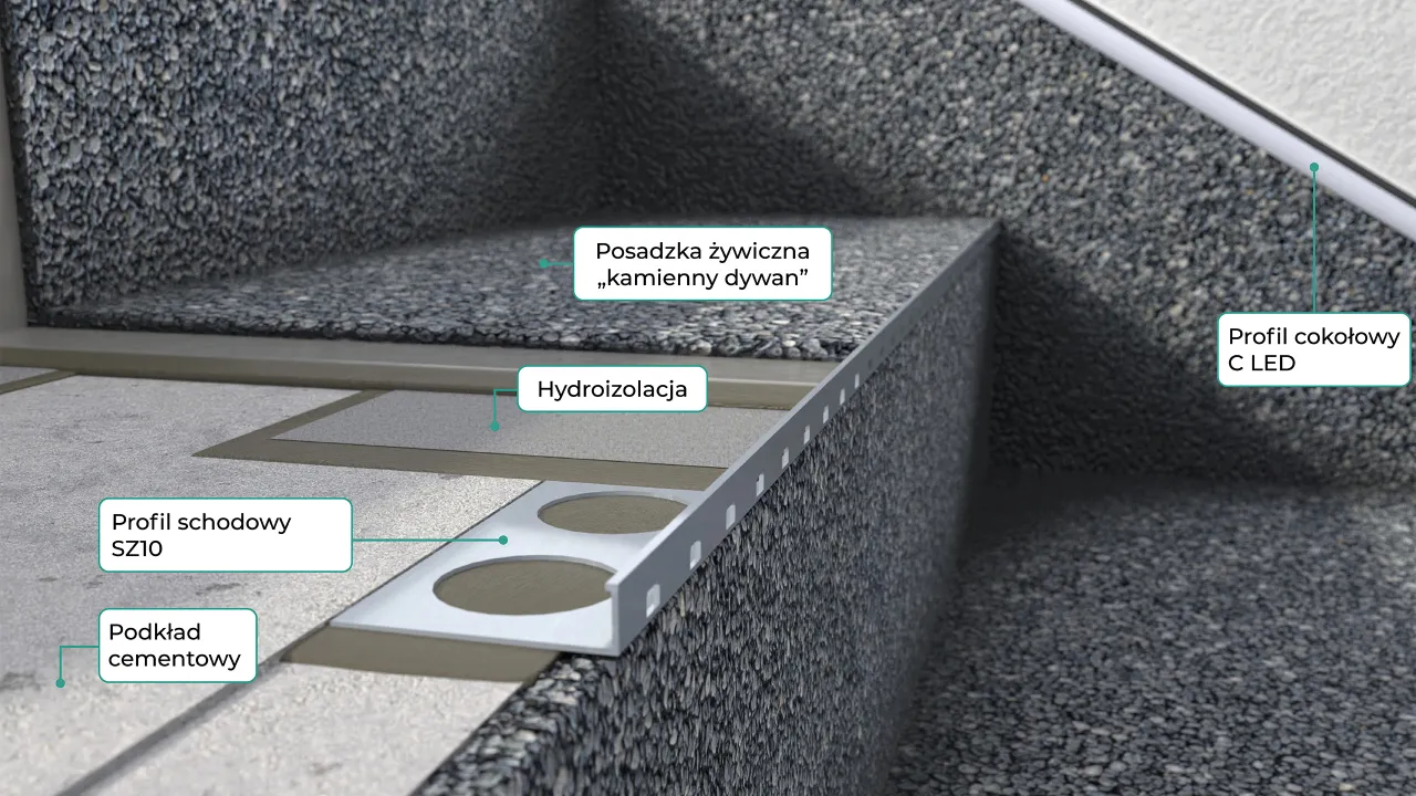 Profil schodowy SZ10, przeznaczony do wykończenia krawędzi stopni z posadzką żywiczną typu "kamienny dywan".